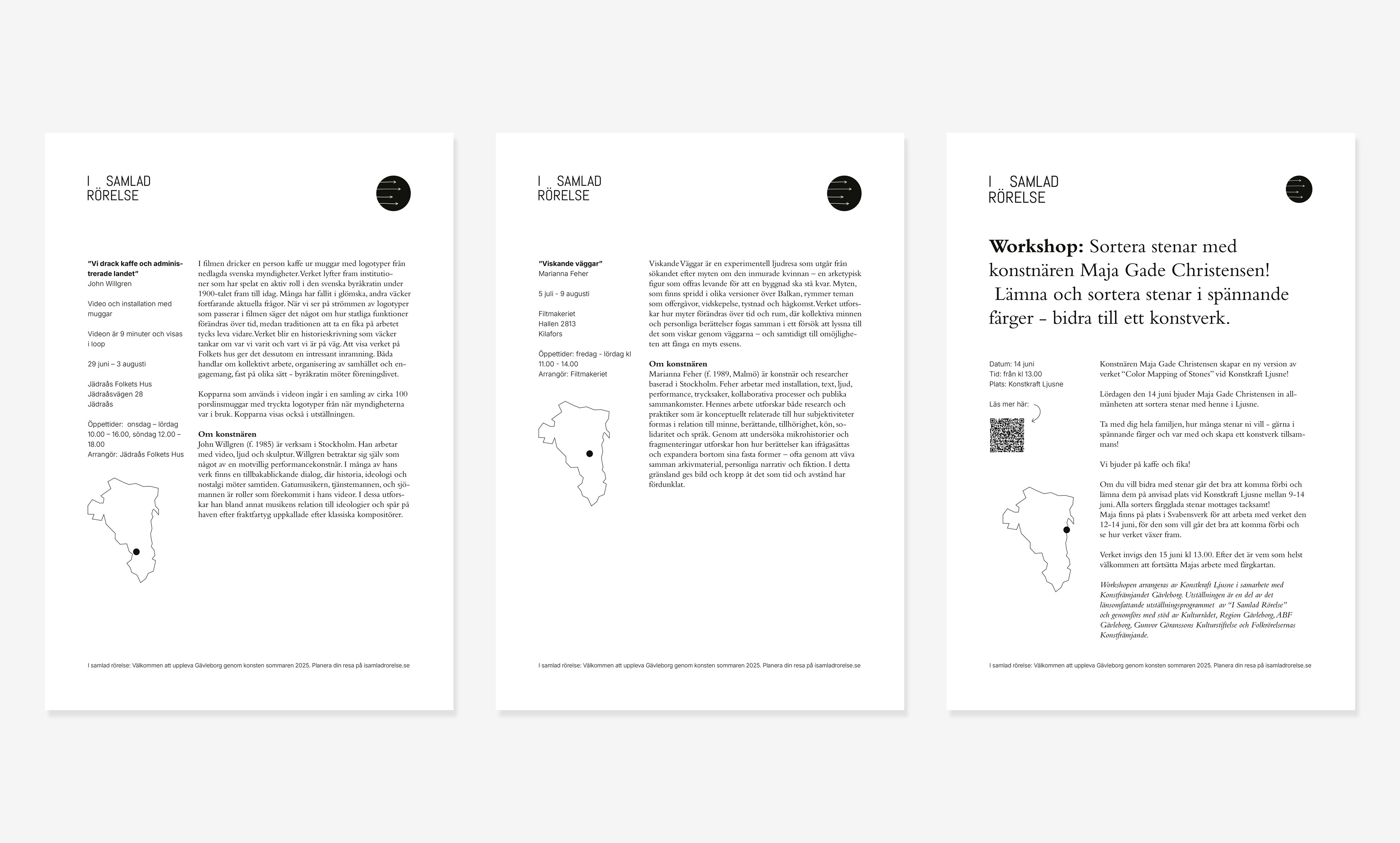 I samlad rörelse var ett länsomfattande utställningsprogram med utställningar och event runt omkring Gävleborg sommaren 2025. I samarbete med Konstfrämjandet Gävleborg tog Studio Petter Olsson fram logotyp och grafisk profil för projektet. Ett visuellt uttryck för att samla de olika utställarna under en gemensam rubrik. En samlad rörelse.